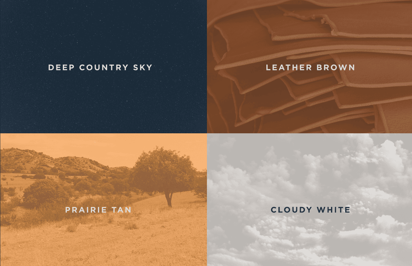 A deep country sky, brown leather tags, the tan of a vast prairie, and the white cloudy skies. Muted and relevant to the area. The clothing told the story, and the colors were just along for the ride.