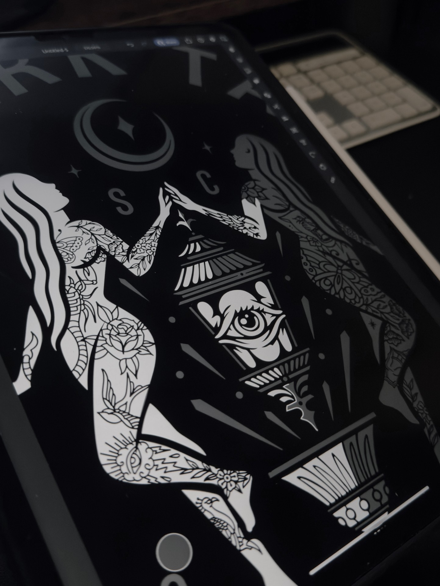 Surrounding the lantern are two female figures, each one representing an individual perspective. The flash style tattoos they are covered in reflect his artistic identity. Those illustrations became a project of their own, balancing intricate flash-style detail with practical scalability. Together, the full lockup works in large-scale print, while the lantern can stand alone for smaller applications.